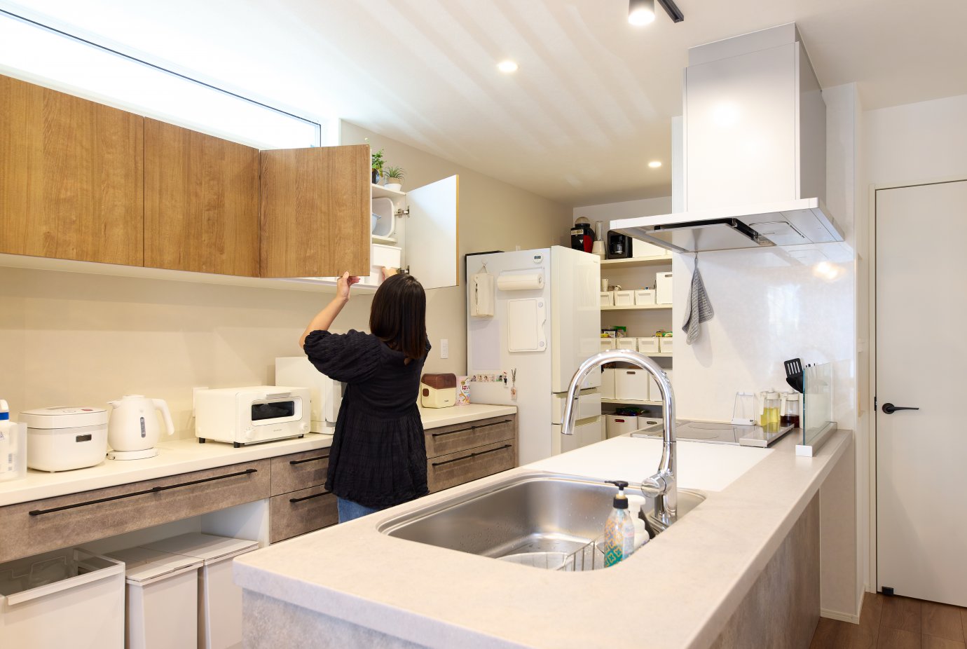 キッチンには、パントリーやクローゼットへと回遊できるアイランドキッチンを採用。 家の中を行き止まりなく移動でき、家事の動線が自然と短縮されます。